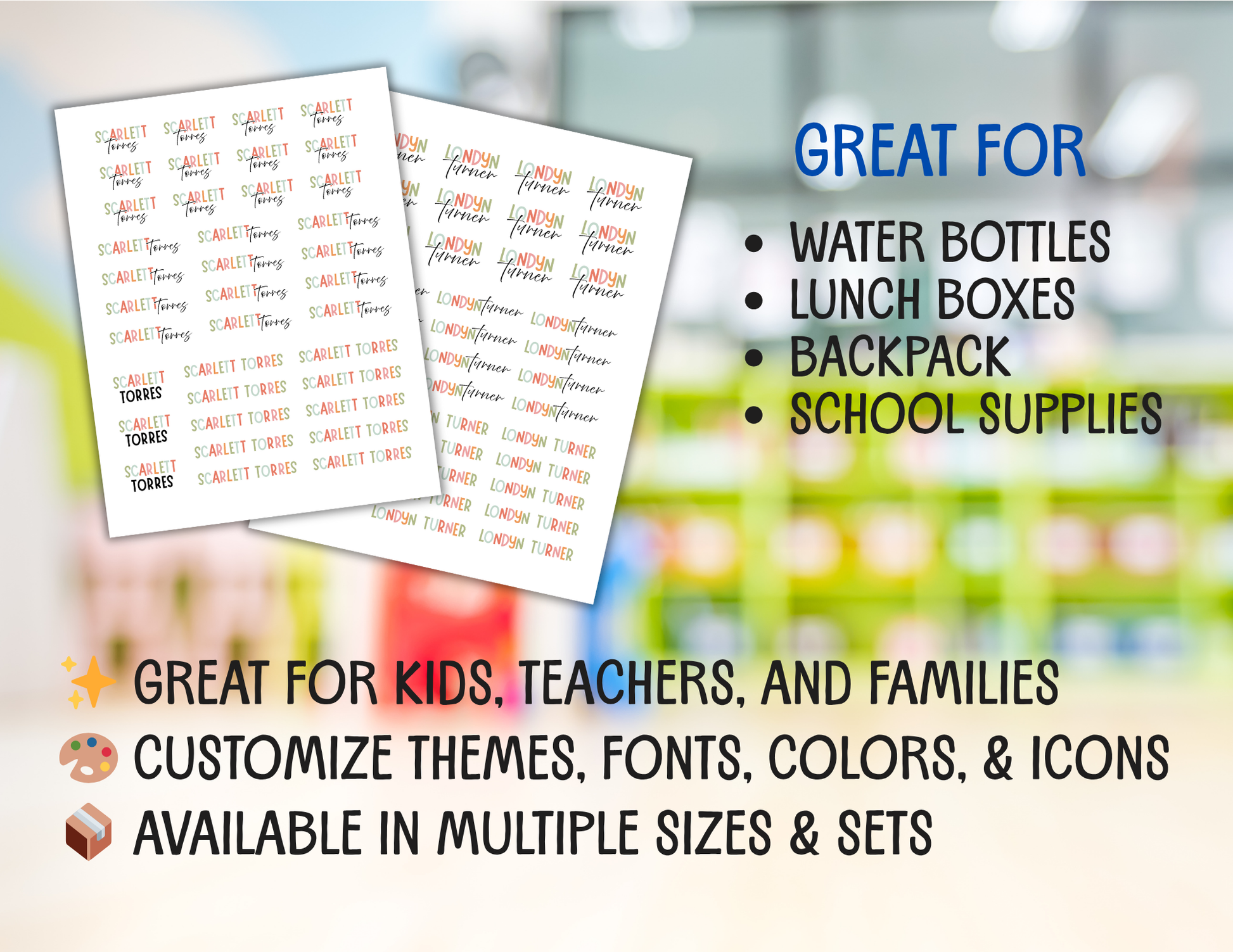 Stay organized in style with our durable custom name labels—perfect for school supplies, water bottles, lunchboxes, clothing, and more! Personalize with your child’s name, favorite colors, or fun icons. Fade-resistant, and easy to apply, these labels are made to last through everyday wear and tear.