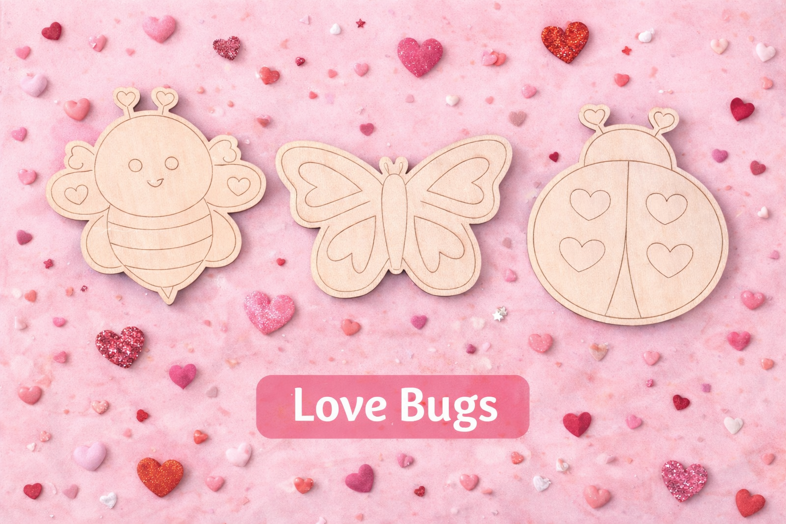 1 laser-cut wood Valentine shape (varies by theme — bee, butterfly, ladybug, donut, cupcake, or ice cream cone) 3 mini paint colors (red, pink, and white) 1 small paintbrush Packaged neatly in a clear bag — ready for gifting or classroom setup