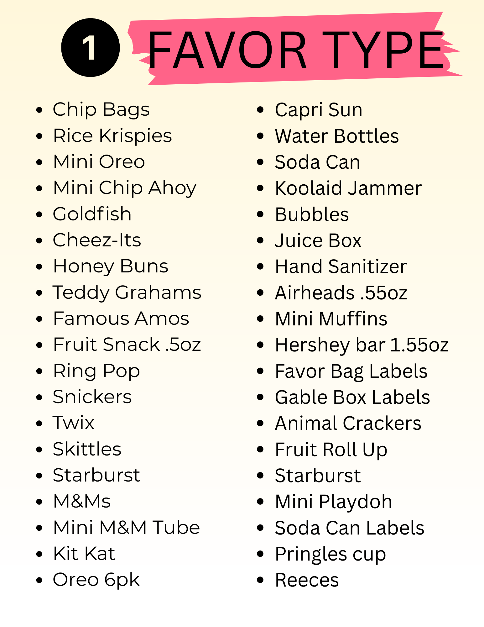 ✔ Choice of favors (chips, juice pouch, water bottle, candy bar, Rice Krispie treat, fruit snacks & more)